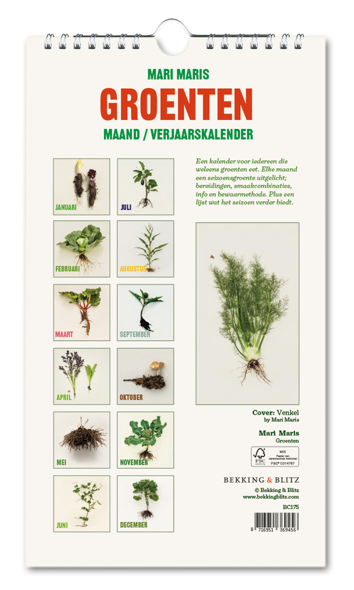 Een kalender voor iedereen die weleens groenten eet. Elke maand een seizoensgroente uitgelicht; bereidingen, smaakcombinaties, info en bewaarmethode. Plus en list wat het seizoen verder biedt.