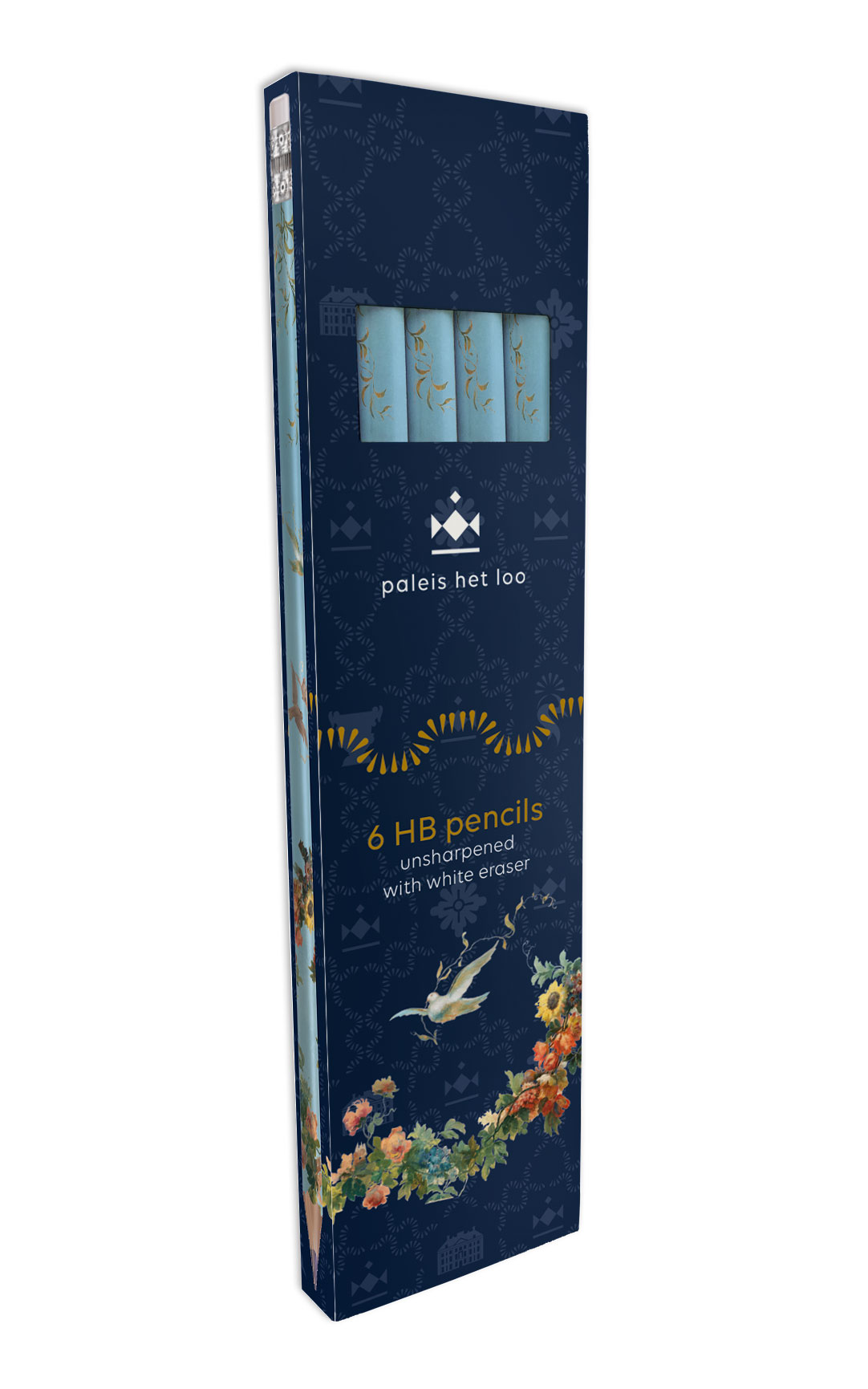 Set van 6 met kleurrijke kunst bedrukte HB potloden in kartonnen doosje, inclusief gum Lengte 19 cm Doorsnede 0,5 cm